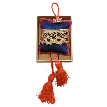 Γούρι μαξιλαράκι απο μπλε βελούδο και φούντα για τη νέα χρονιά