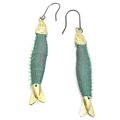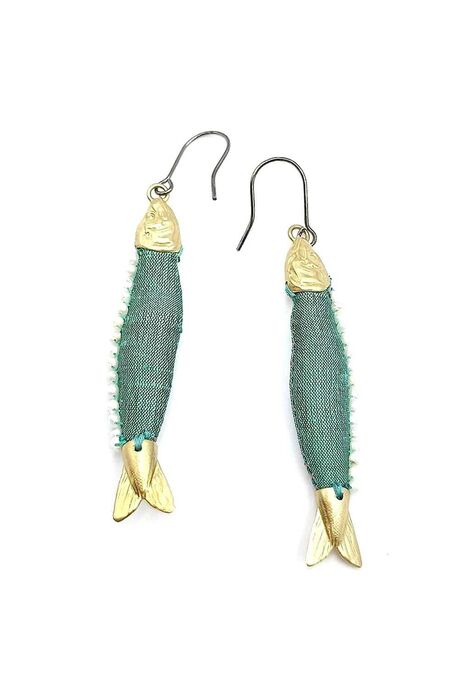 Χειροποίητα σκουλαρίκια ψάρια απο μπρούτζο, μαργαριτάρια και πράσινο μεταξωτό ύφασμα.