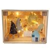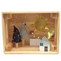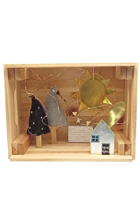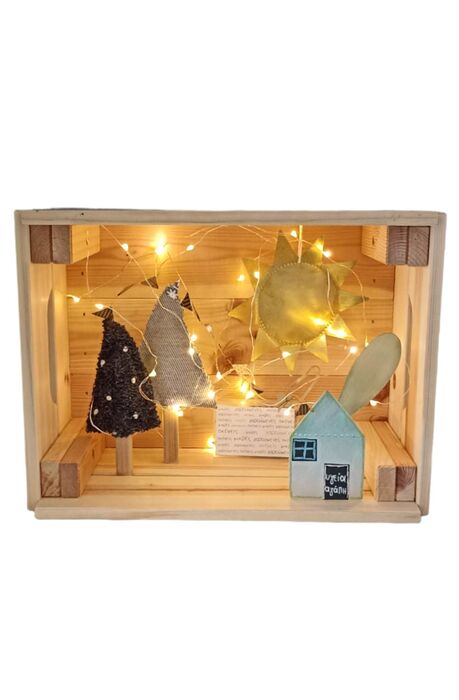 Χειροποίητο ξύλινο φωτιστικό, με σπίτι, δέντρα και ήλιο.