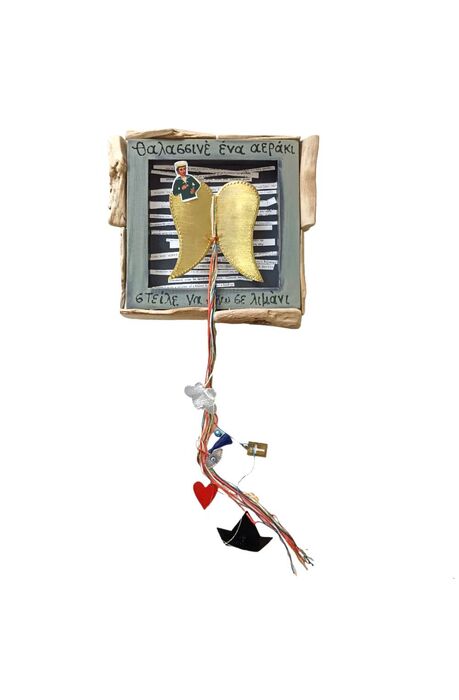 Φτιαγμένο με μεράκι, από ξύλο, φύλλα αλουμινίου και κορδέλες βαμβακερές.