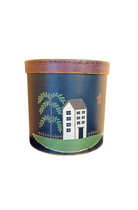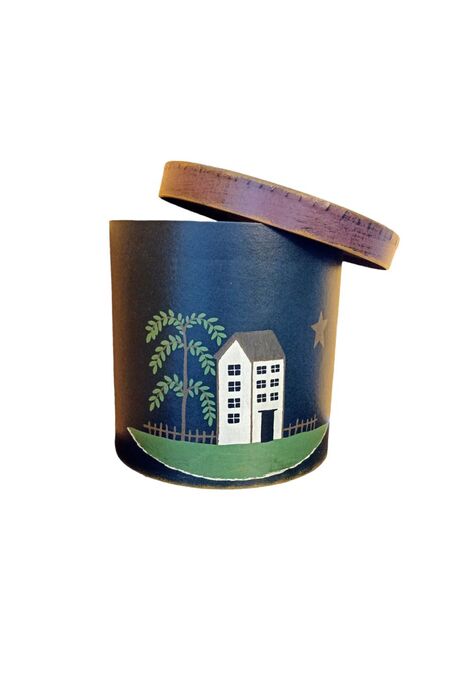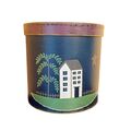 Στρογγυλό vintage χάρτινο κουτί με καπάκι και ζωγραφιά σπίτι και δέντρο.