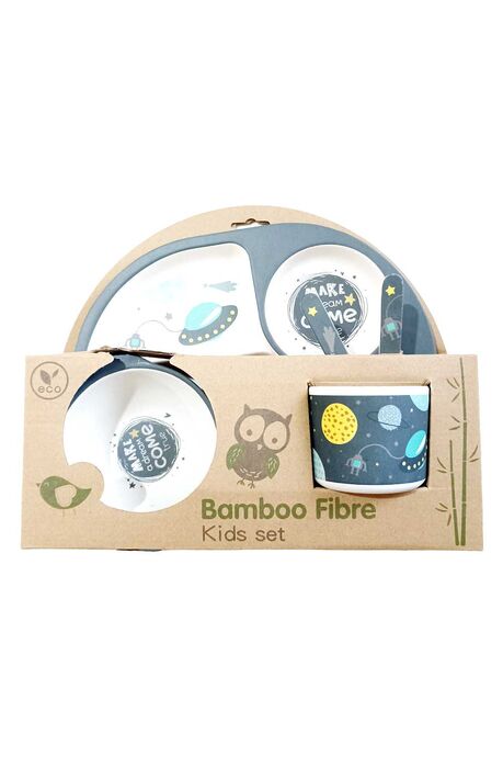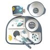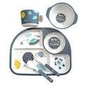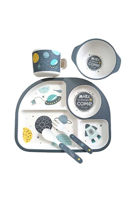 Περιλαμβάνει πέντε τεμάχια, πιάτο, μπολάκι, πιρούνι και κουτάλι για να το εκπαιδεύσουμε να τρώει μόνο του.