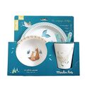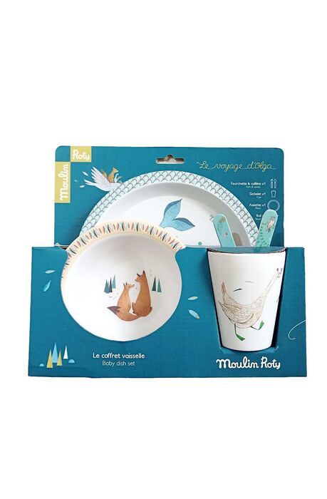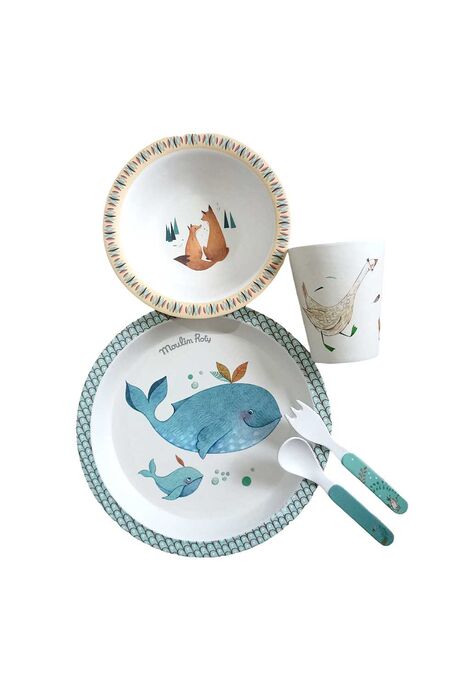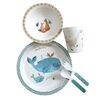 Περιλαμβάνει πέντε τεμάχια, πιάτο, μπολάκι, πιρούνι και κουτάλι για να το εκπαιδεύσουμε να τρώει μόνο του.