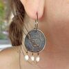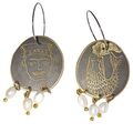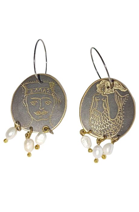 Χειροποίητα σκουλαρίκια με χαραγμένο έναν ναύτη και γοργόνα, δεμένα με μαργαριτάρια.