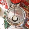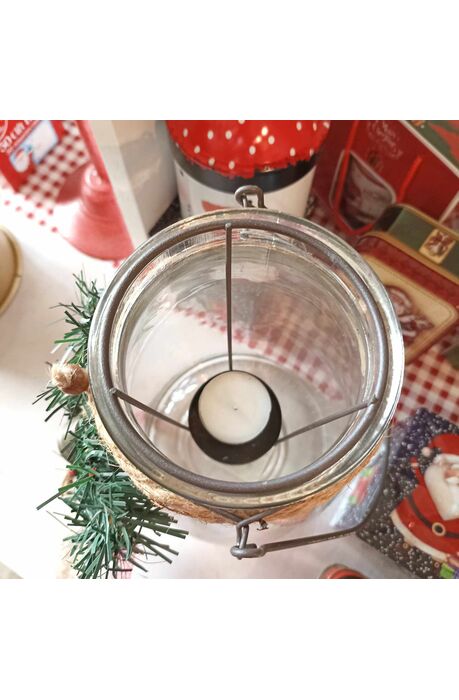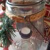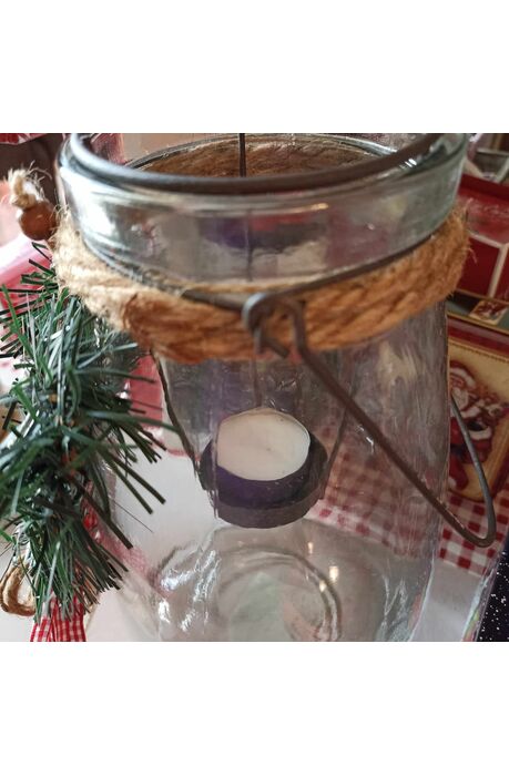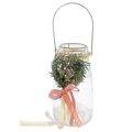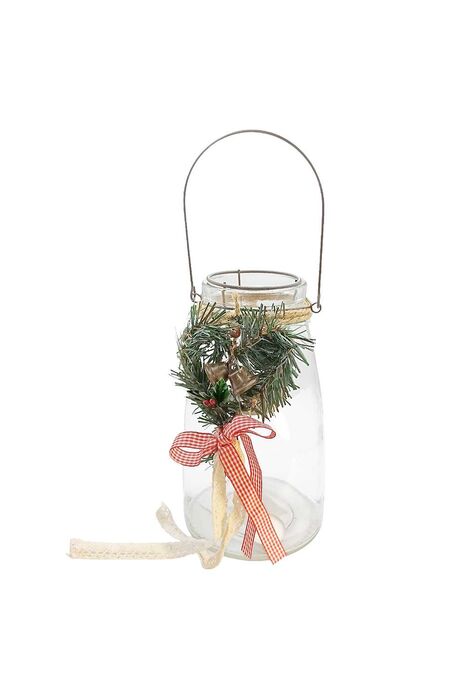 Γυάλινο φανάρι με στεφανάκι καρδιά, γκι ,καμπανούλες, δεμένα με δαντέλες και κορδέλες.