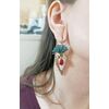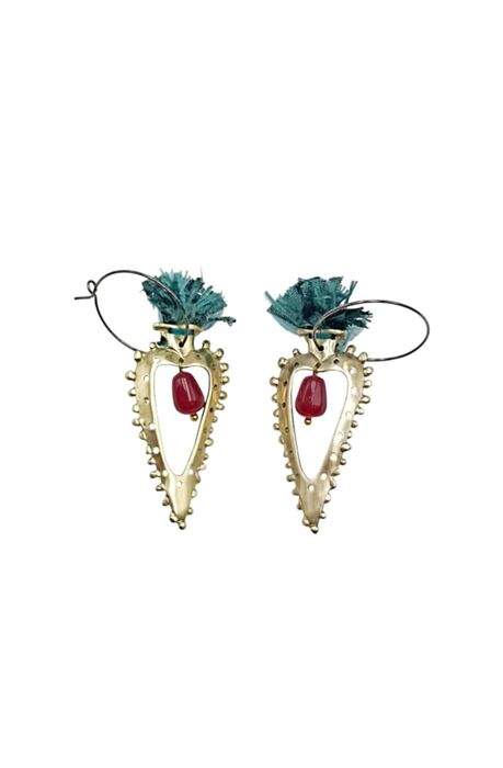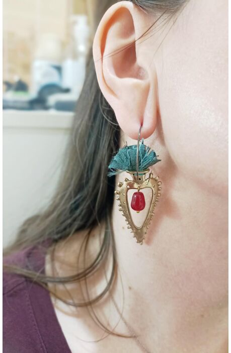 Υλικά: μπρούτζος ,κόκκινη ημιπολύτιμη πέτρα και βαμβακερό ύφασμα και κρίκοι απο ασήμι 925.