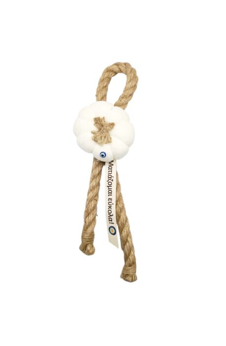 Το λευκό διακοσμητικό υφασμάτινο σκόρδο, το μάτι για την προστασία απο την βασκανία και το φυσικό σχοινί,