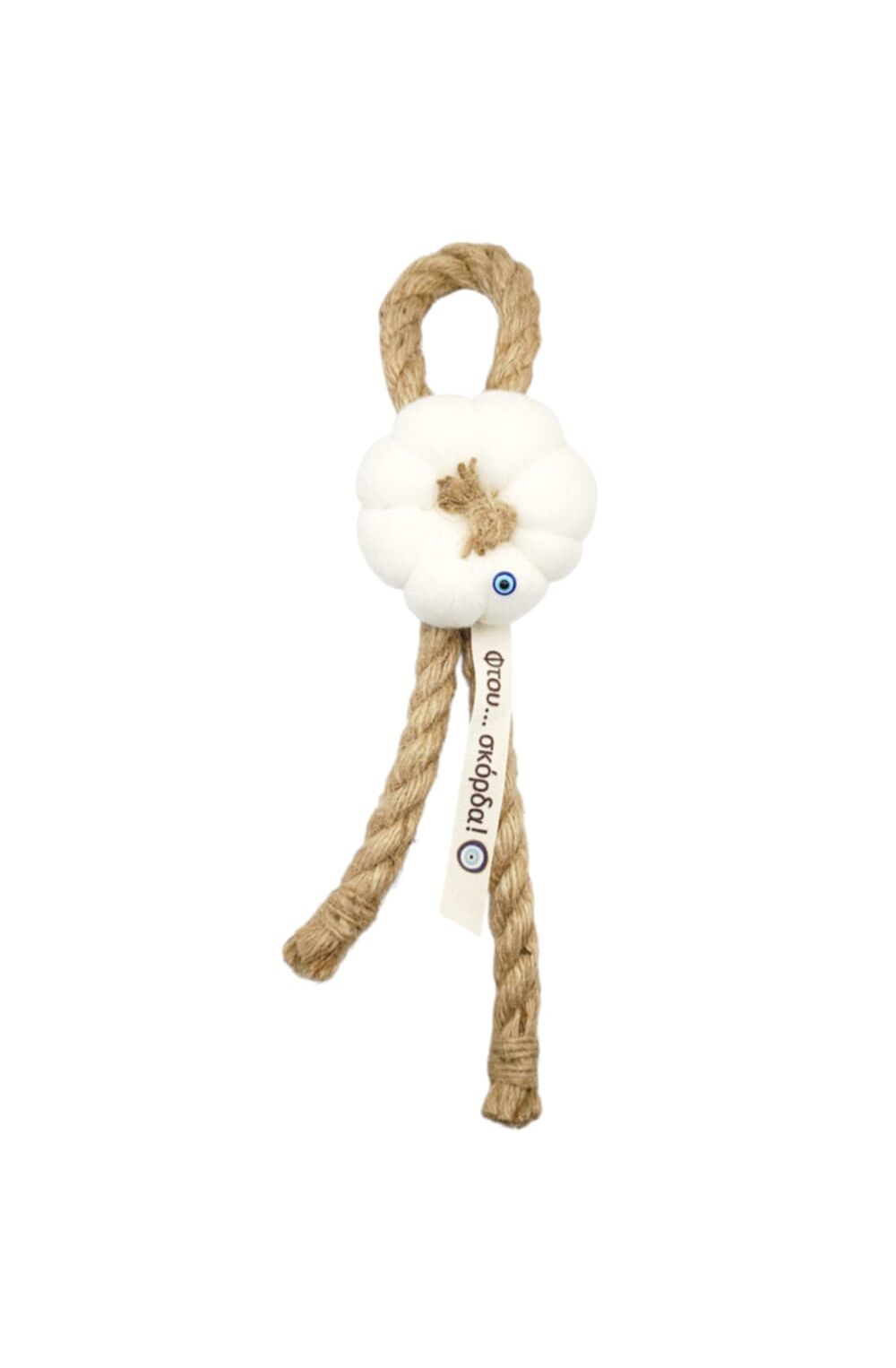 Το λευκό διακοσμητικό υφασμάτινο σκόρδο, το μάτι για την προστασία απο την βασκανία και το φυσικό σχοινί,
