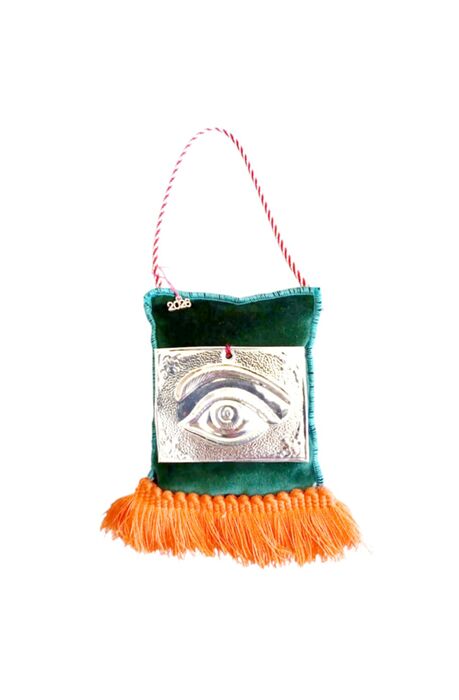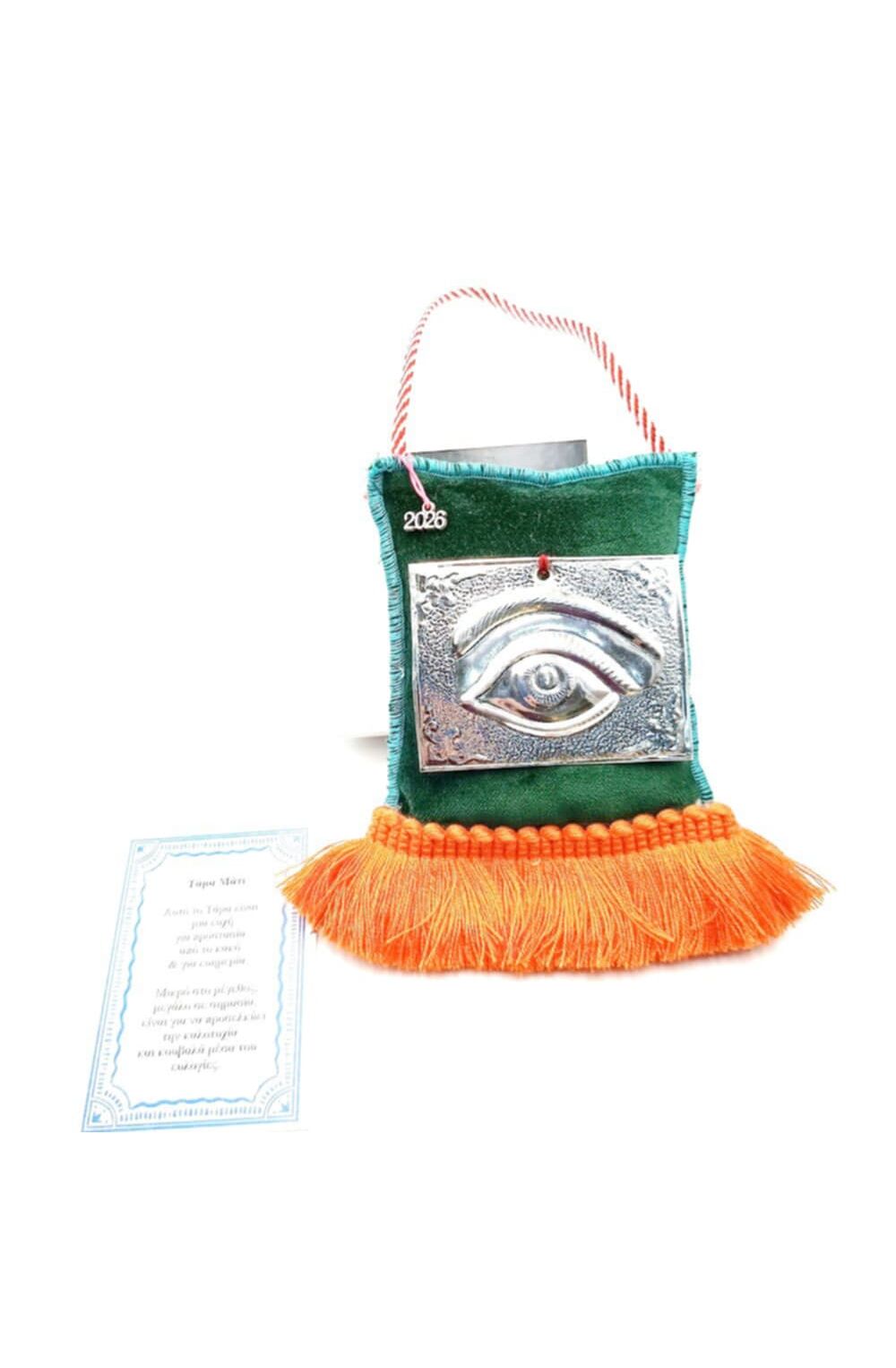 Ένα μοναδικό γούρι για τη νέα χρονιά, με ασημί μεταλλικό μάτι πάνω σε μαξιλαράκι απο βελούδο.