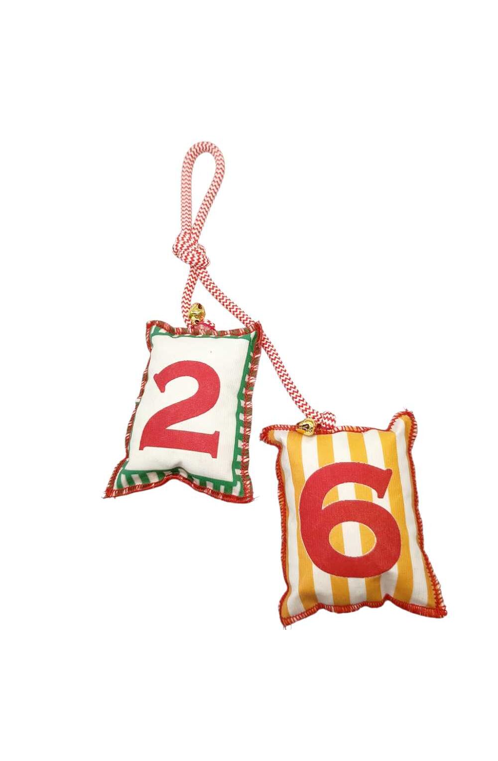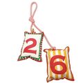 Χειροποίητα κρεμαστά μαξιλαράκια, με το 26,διακοσμημένα με κόκκινο κορδόνι και καμπανάκια.