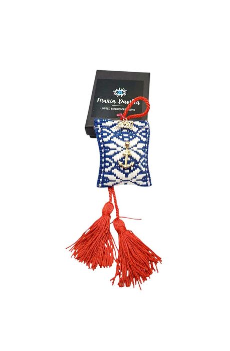 Χειροποίητα κρεμαστό μαξιλαράκι, με διακοσμητικό, χρυσή άγκυρα, διακοσμημένο με κόκκινο κορδόνι και φούντες.
