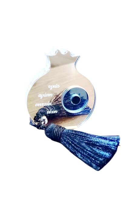 Χειροποίητο επιτραπέζιο γούρι ρόδι, απο ασημί καθρέπτη plexi glass, διακοσμημένο με μπλέ φούντα.