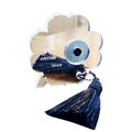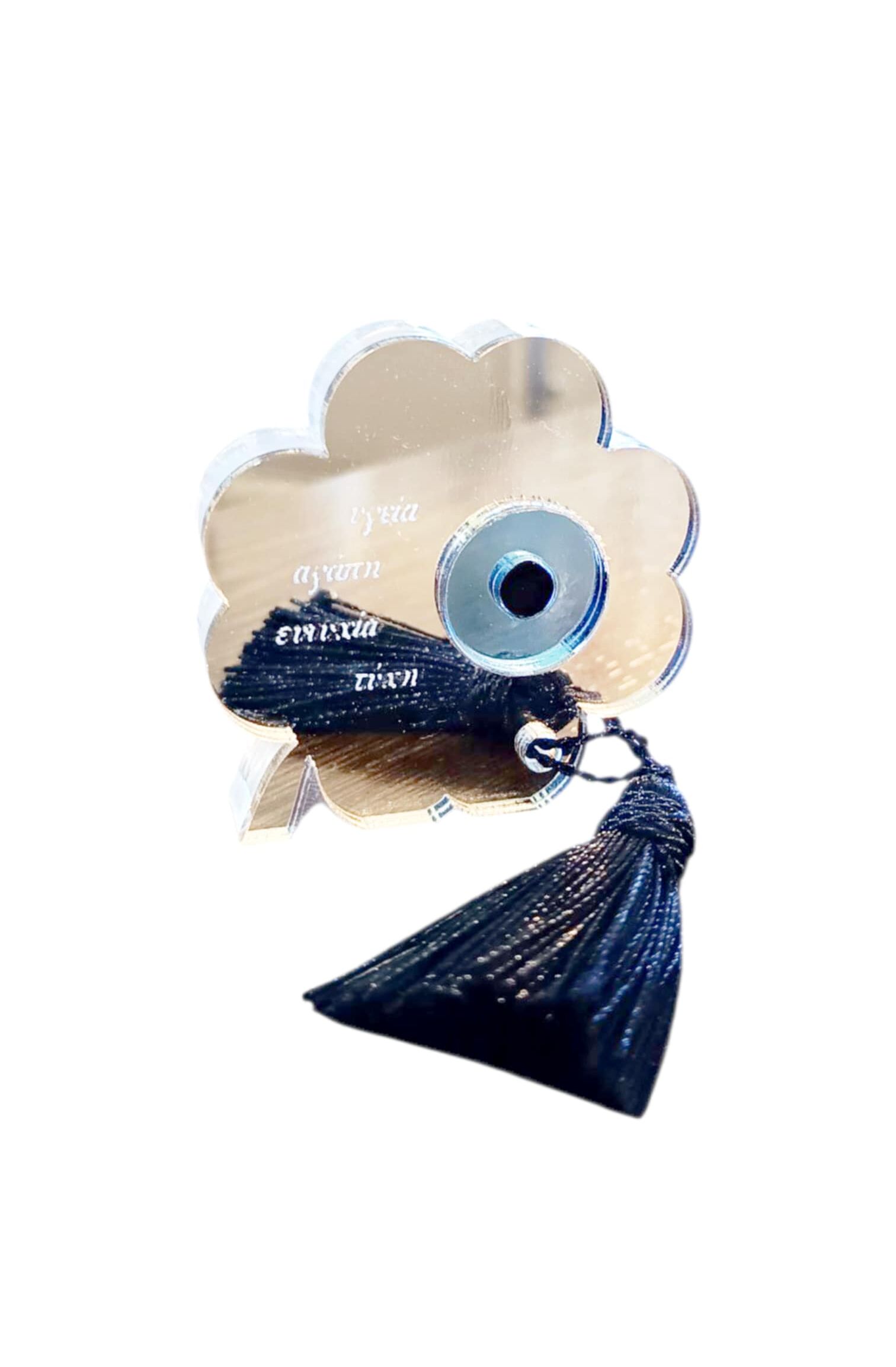 Χειροποίητο επιτραπέζιο γούρι τετράφυλλο, απο ασημί καθρέπτη plexi glass, διακοσμημένο με μπλέ φούντα.