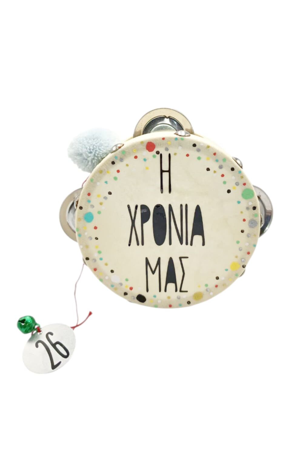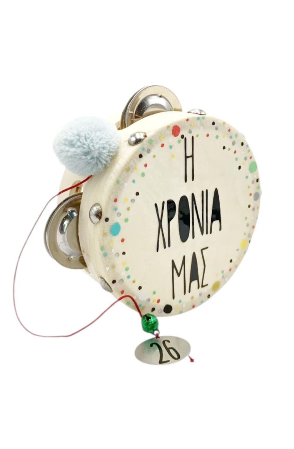 Χειροποίητο γούρι ντέφι, ζωγραφισμένο στο χέρι με μήνυμα '' Η χρονιά μας ''.