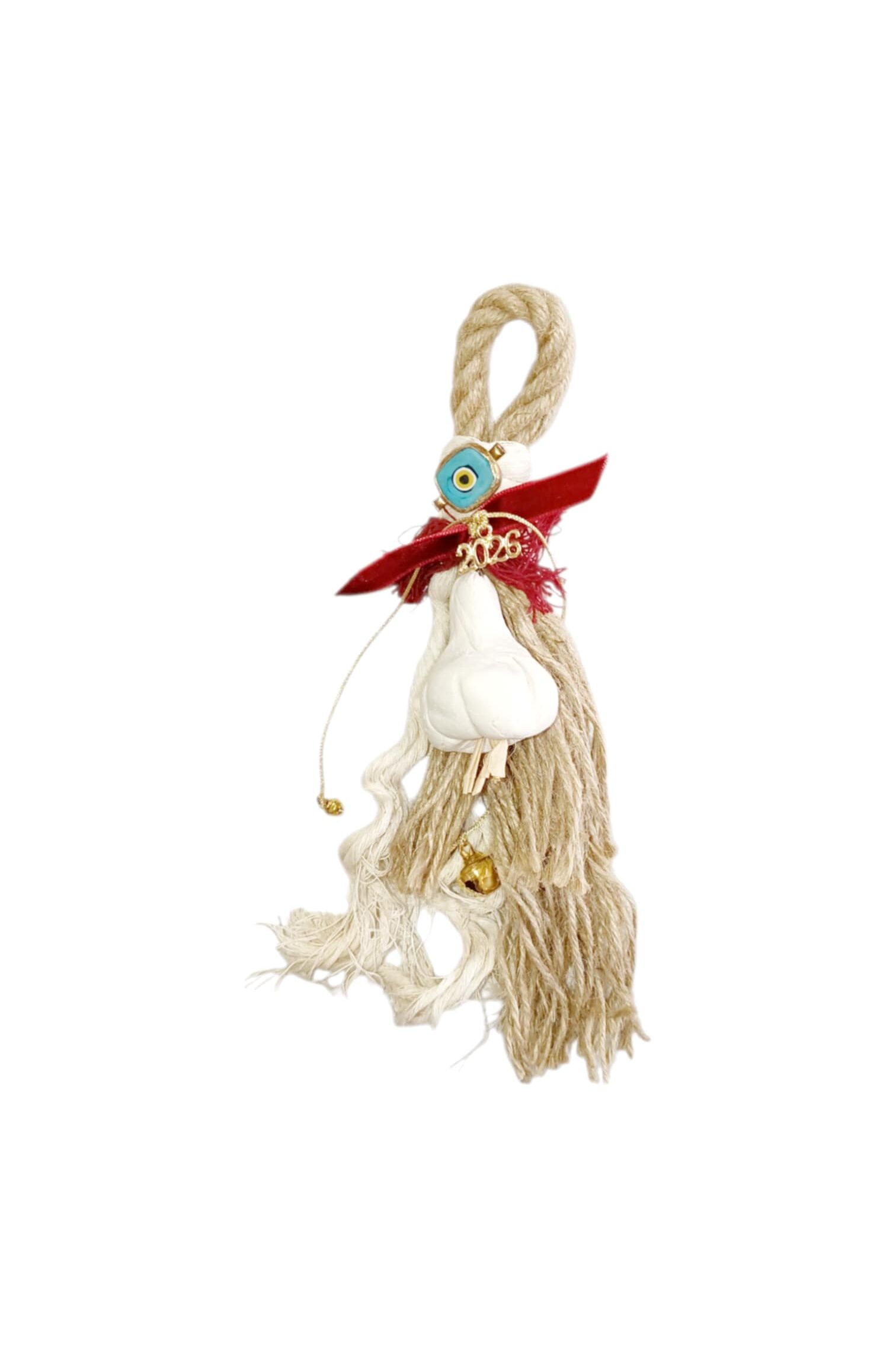 Το λευκό διακοσμητικό πήλινο σκόρδο, το μάτι για την προστασία απο την βασκανία και το φυσικό σχοινί,