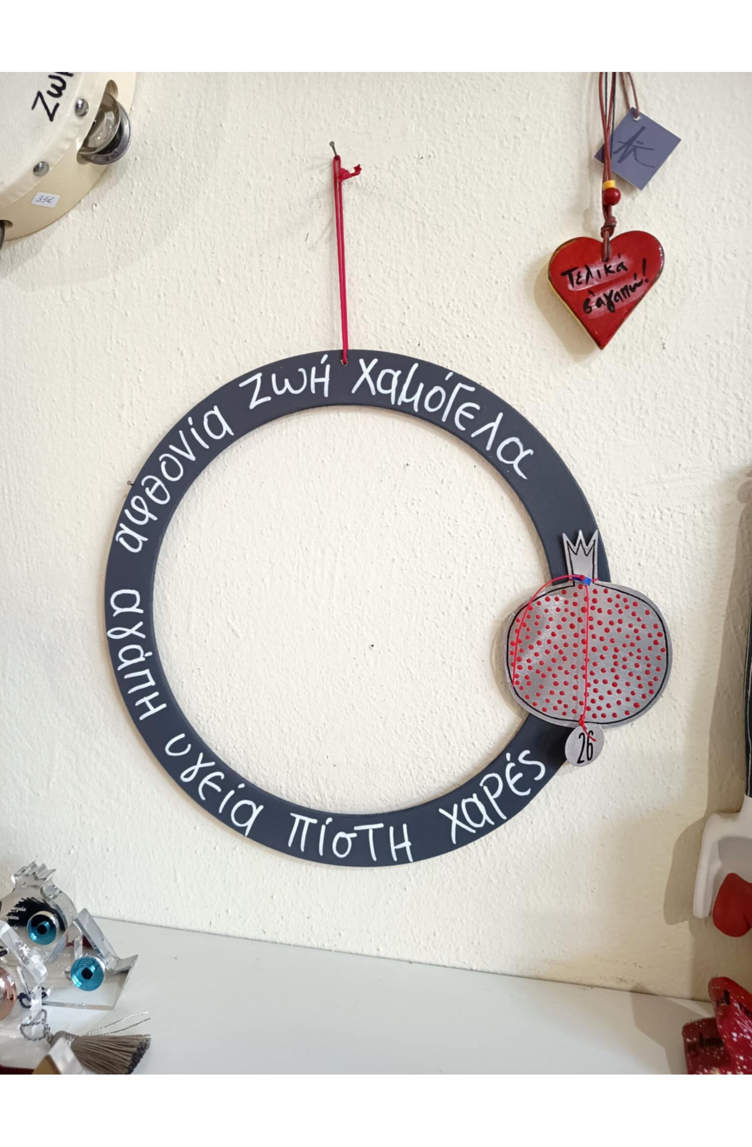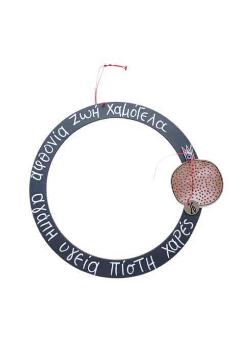 διακοσμημένο με ρόδι, μάτι, στοιχείο 26 και ευχές για αγάπη,υγεία,πίστη,χαρές,αφθονία ,ζωή και χαμόγελα.