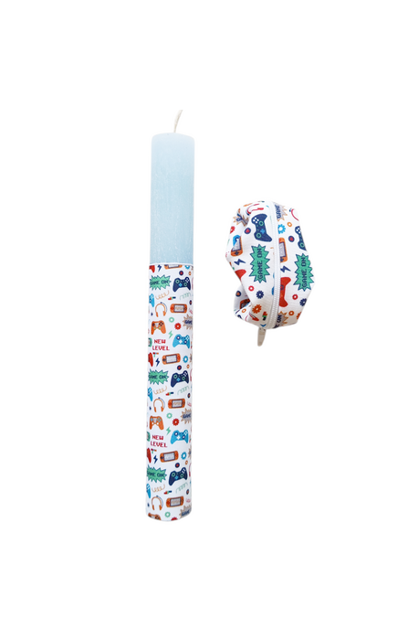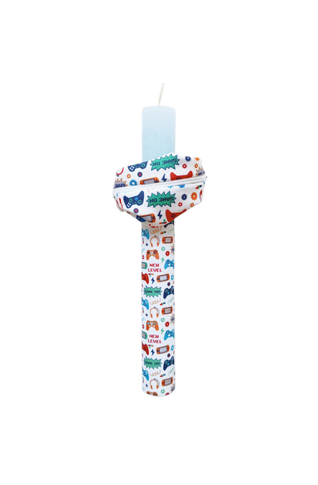 Πασχαλινή χειροποίητη αρωματική λαμπάδα playstation με χειροποίητο πάνινο παιδικό πορτοφολάκι καρπού